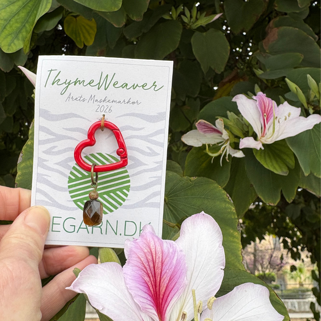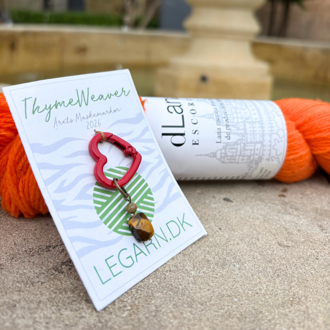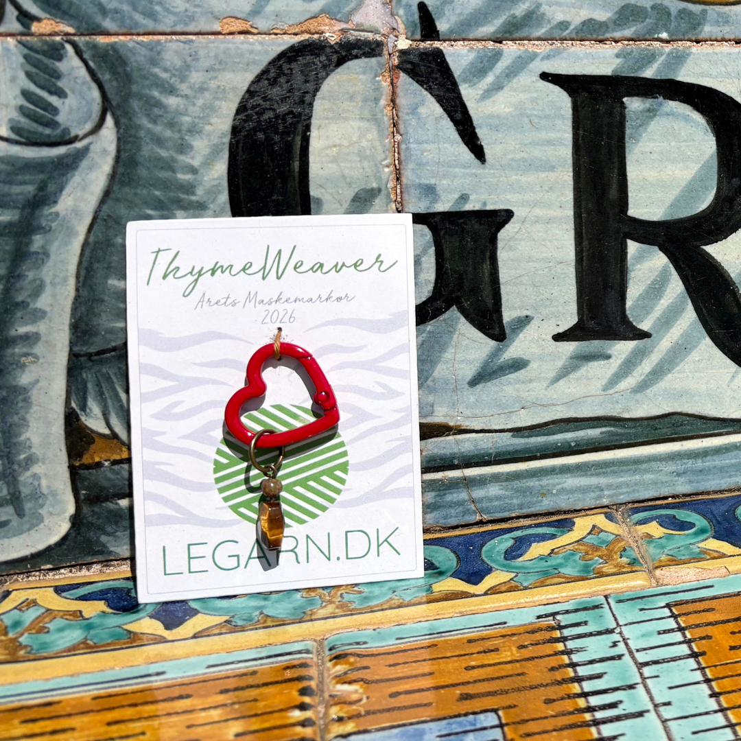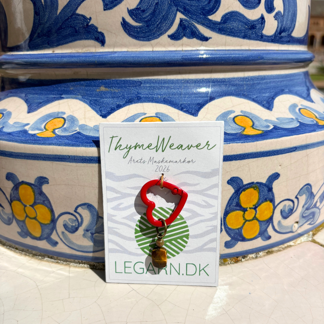Den har en rød hjertekarabin – et symbol på den store kærlighed, der binder vores strikkefællesskab sammen. Sæt den på din projekttaske, og bær din voksende samling af markører med dig – en påmindelse om, at hver eneste maske er en del af noget, vi deler.