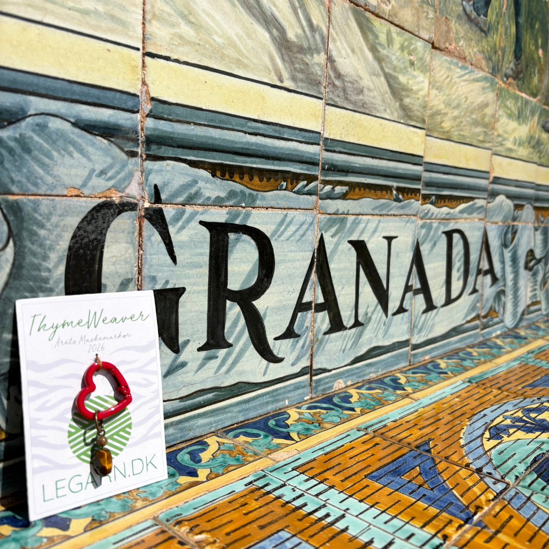 Den er sat sammen med en Unakit i grønne og røde nuancer – farverne fra Granadas flag, hvor hver markør er kærligt håndlavet. Unakit er en sten for taknemmelighed og balance og minder os om at værdsætte det, vi har, og ære den kreative rejse.