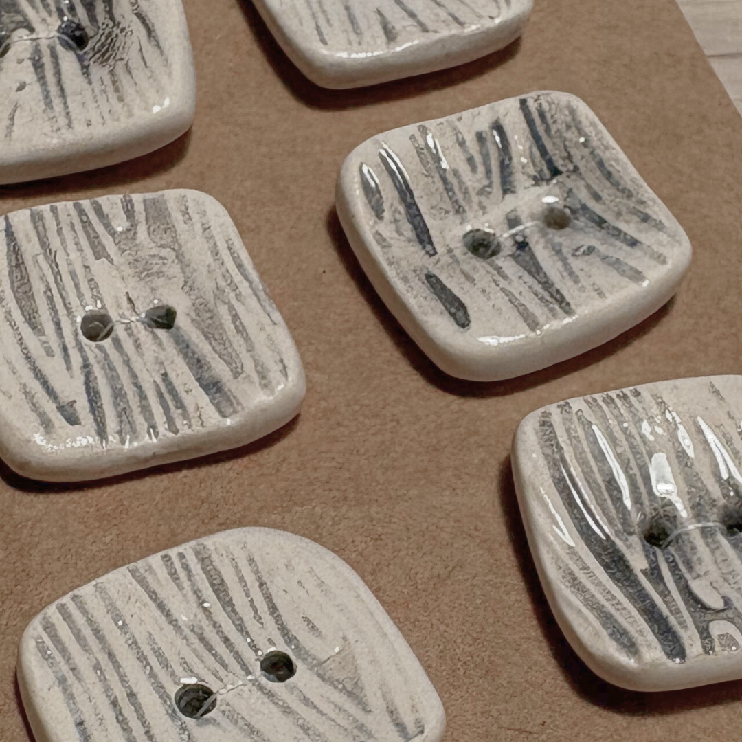 Disse knapper er individuelle keramikstykker, håndlavede en ad gangen af den dygtige spanske strikker, hækler og keramiker Martina Perino, som forkæler os med hendes smukke kunstneriske knapper.