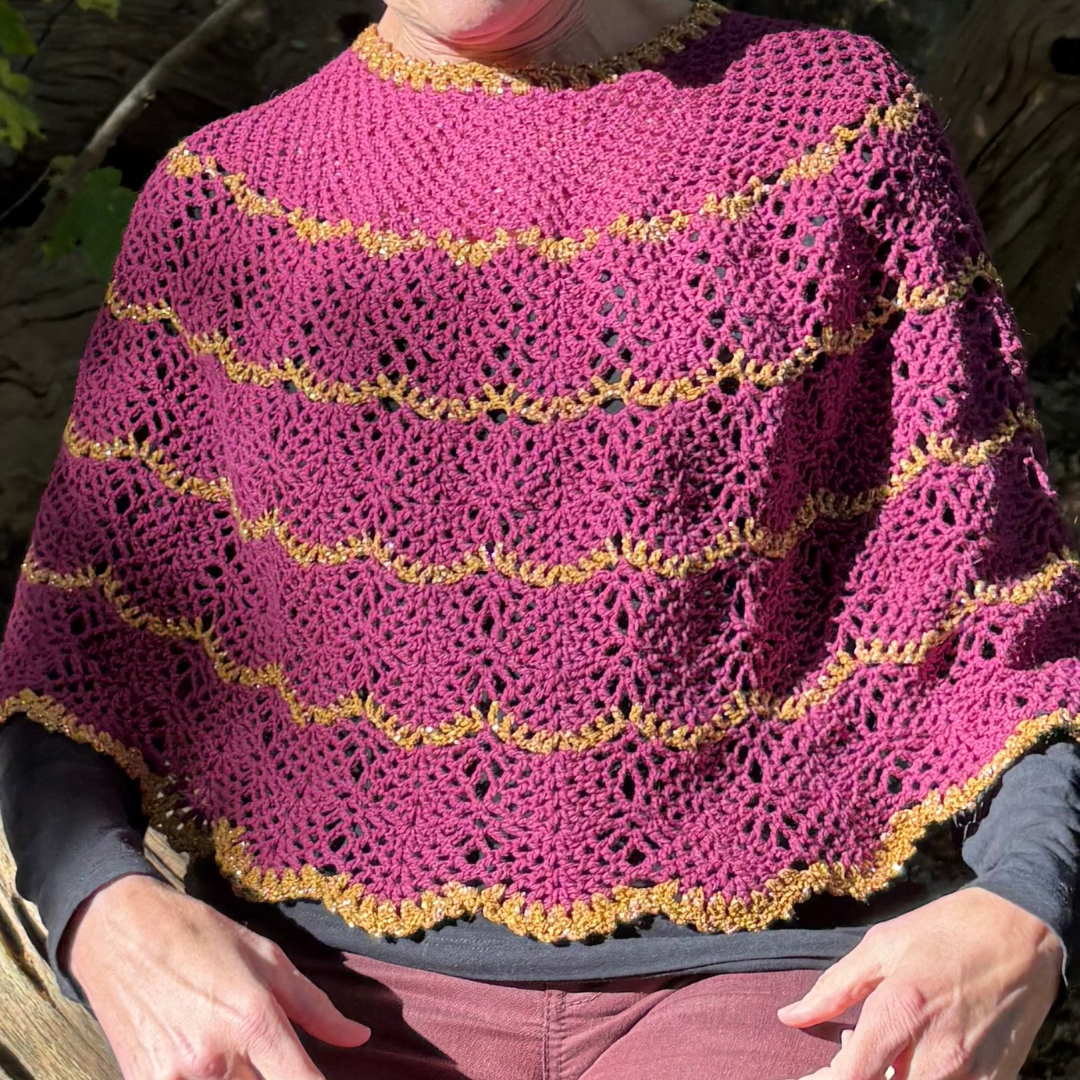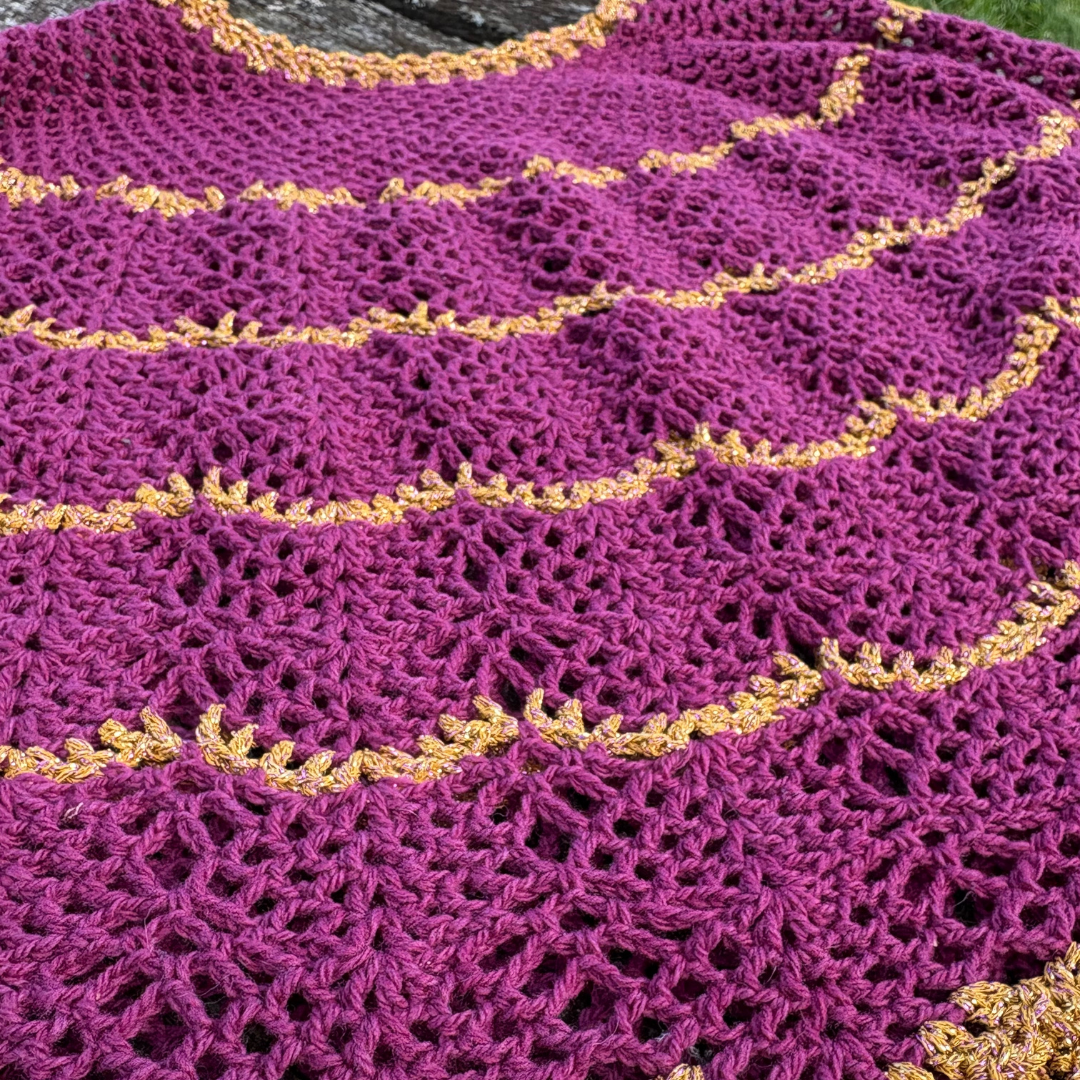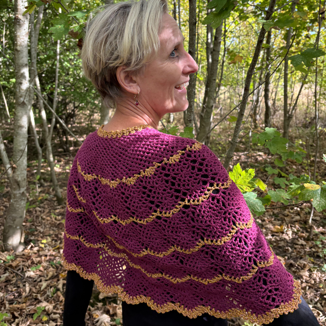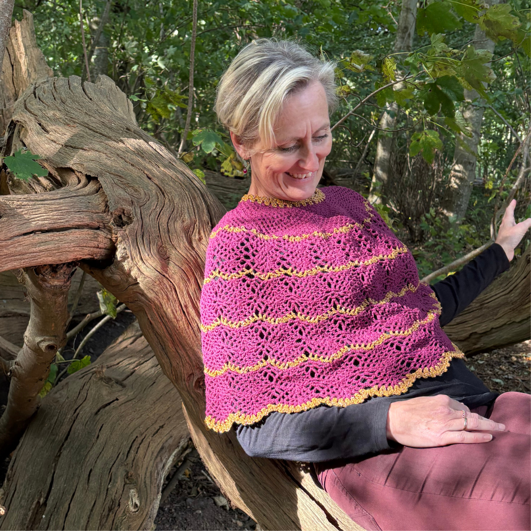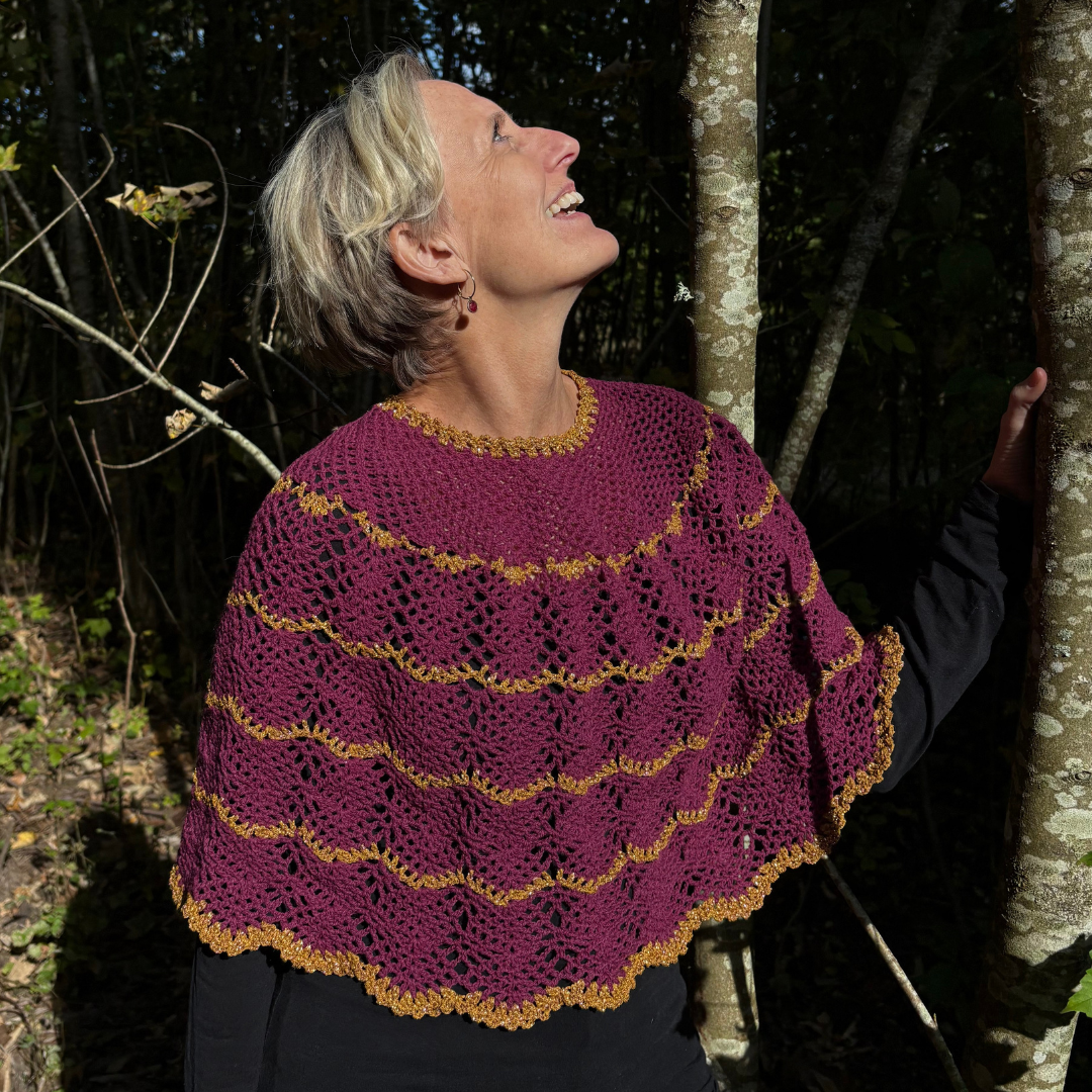 Denne smukke Mañanita er designet af Janne Juul. Denne version af mañanita passer godt til efterår og vinter. Den er hæklet i vores bløde Sorrosal 100% merinould (100 g/370 m) fra dLana. Den ene model er hæklet i ren Sorrosal i farven “Havblå” med en stribe af “blomme”. Den anden er hæklet i farven “blomme” med kanterne hæklet i dobbeltråd Brillino (50g/370m) fra Casasol. Her er brugt farven Bronze med lilla. Vi har også tilføjet nogle striber af glimmer for at give den ekstra elegance. Du vælger selv om du vil have kittet med glimmergarn eller uden og hvordan du bruger glimmeret. Det er ikke dikteret i opskriften.