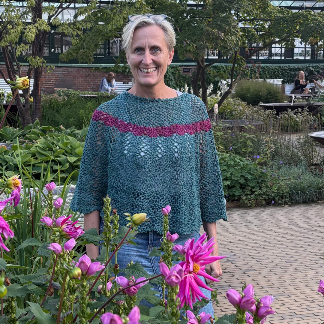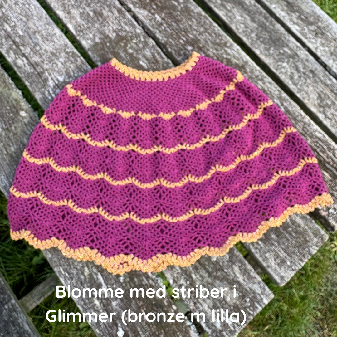 På billedet er Mananita strikket i farven “Blomme” med glimmer “Bronze med lilla”.