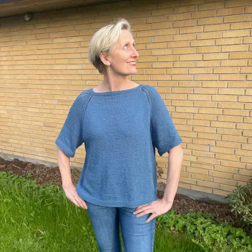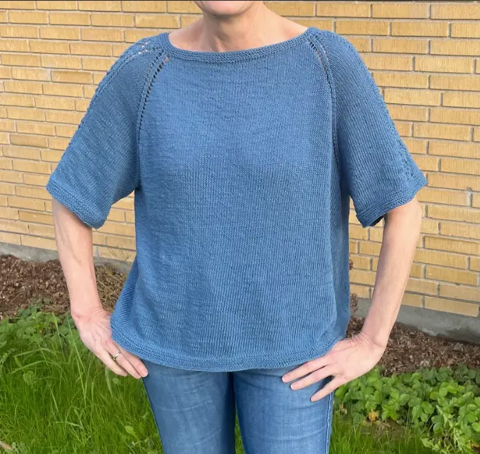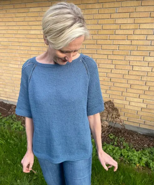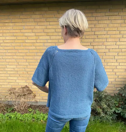 Blusen strikkes oppefra og ned. Der strikkes forhøjet nakke hen over ryggens masker med vendepinde efter German Short Rows-metoden (der er QR-kode til metoden i opskriften). Der strikkes raglanudtagninger – disse laves som omslag på både krop og ærmer. De danner et lille hulmønster omkring to glatstrikkede raglanmasker.