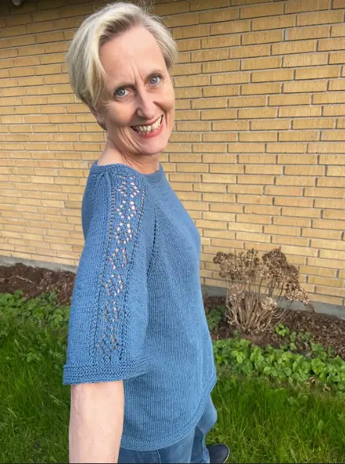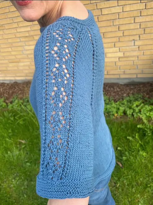 Når bærestykket er strikket, sættes ærmernes masker til hvile, der slås nye masker op under ærmerne, og kroppen strikkes færdig til ønsket længde. Når du skal strikke ærmerne, sættes de hvilende masker tilbage på rundpind eller strømpepinde. Der samles masker op i de opslåede masker under ærmet. Ærmerne strikkes med et fint, gennemgående hulmønster centreret på ærmet. Mønsteret strikkes efter diagram. Bagest i opskriften findes separate diagrammer til hver størrelse samt tilhørende tekst, hvis man ikke ønsker at strikke direkte efter diagram. De øvrige masker på ærmet strikkes i glatstrikning.