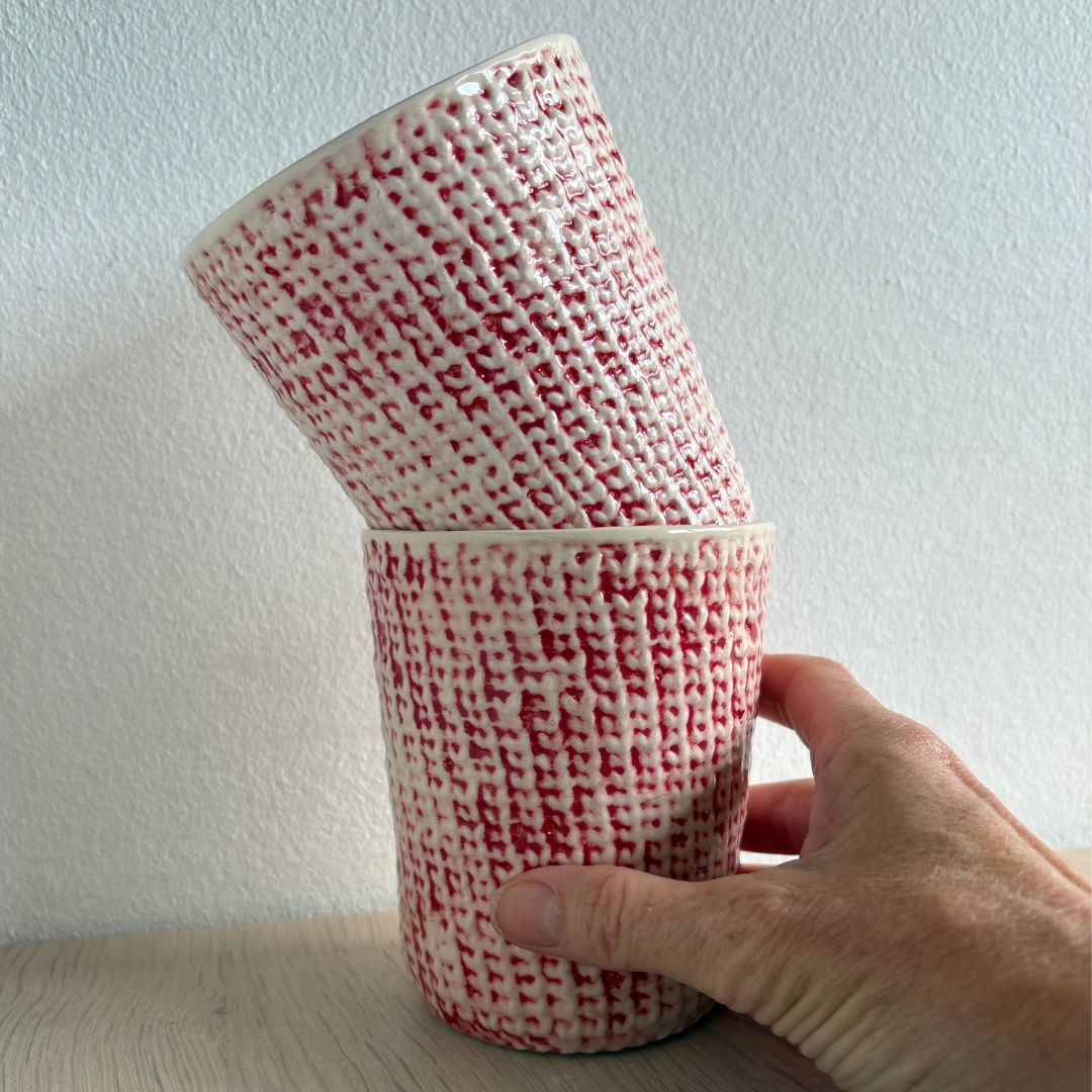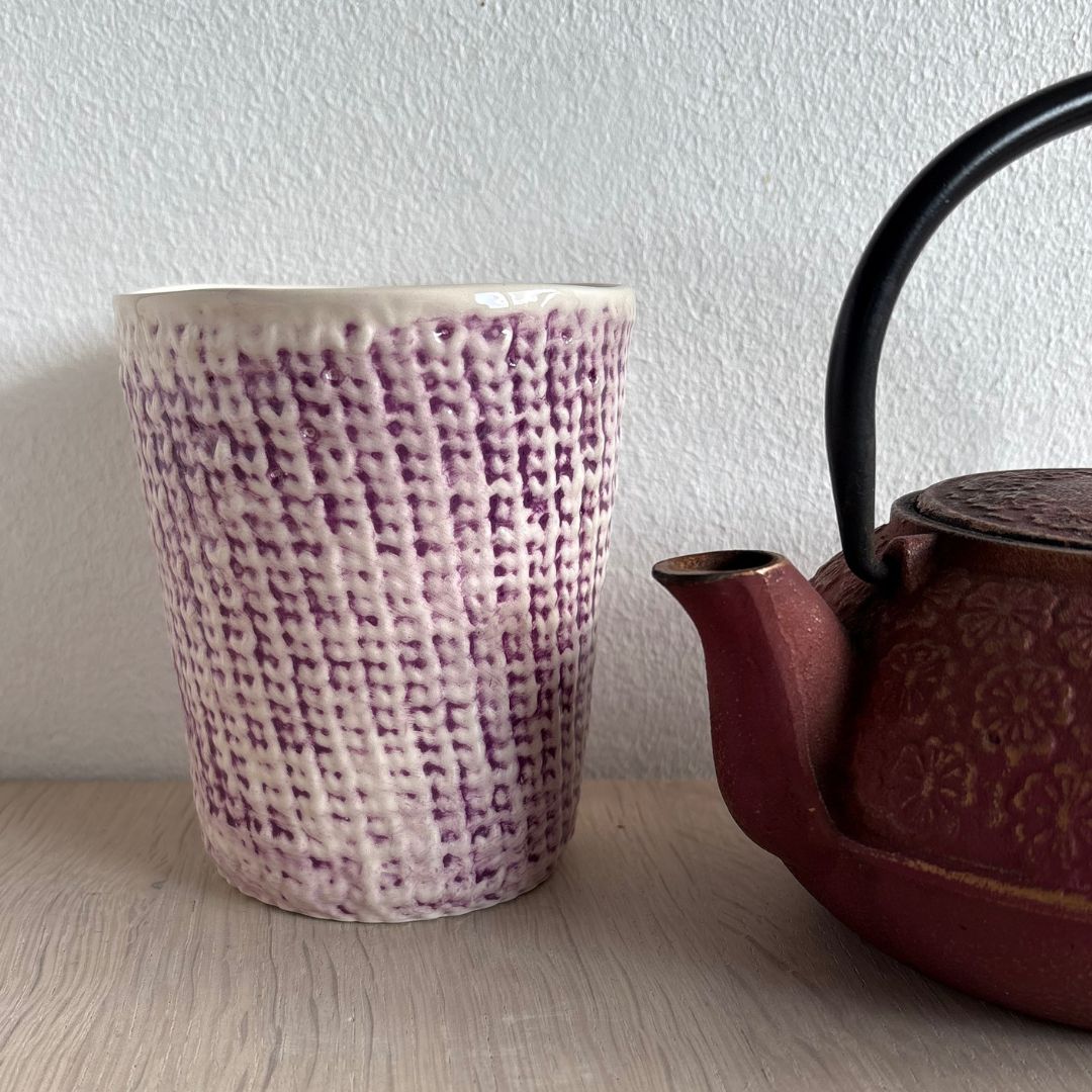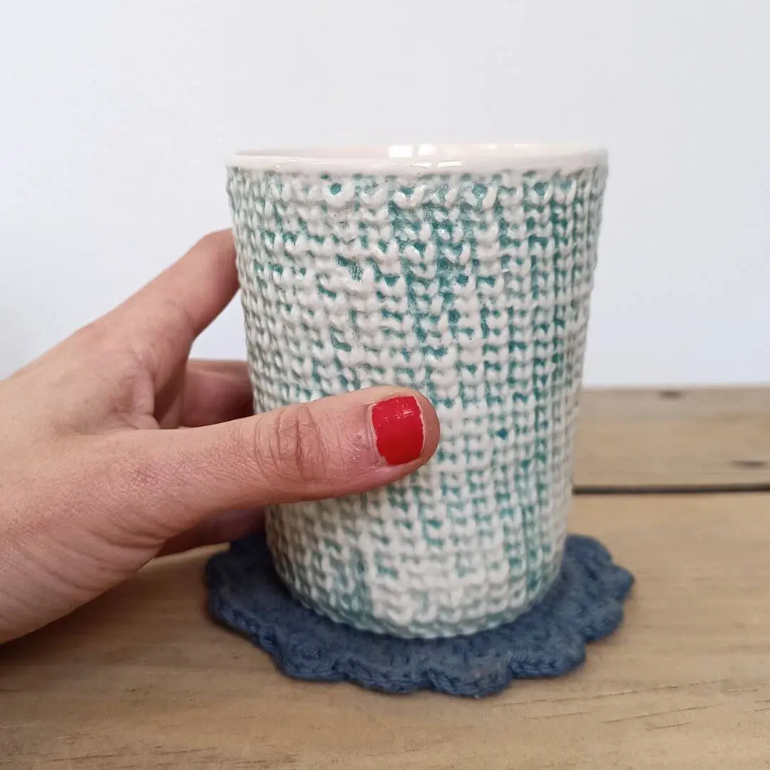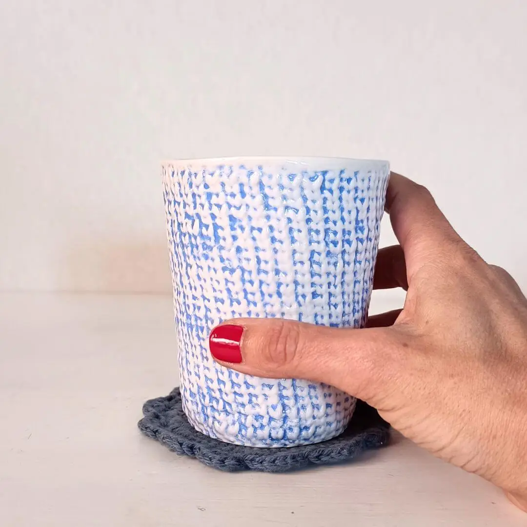 Et håndlavet keramisk stykke kunst. Lavet af den dygtige strikker og keramiker, Martina Perino, der vil glæde os garn-elskere med en smuk kop vi kan nyde vores kolde eller varme yndlingsdrikke i, imens vi strikker. Også perfekt som vase til små buketter eller til altid at have vores pinde, hæklenåle eller sakse ved hånden.
